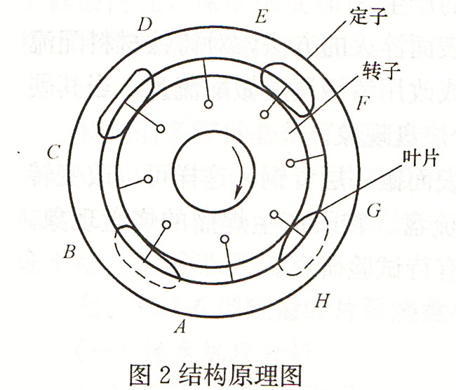將損壞的液壓泵進(jìn)行解剖,發(fā)現(xiàn)定子曲線內(nèi)表面嚴(yán)重磨損(見圖2)。定子由合金鋼制成,其內(nèi)表面由四段圓弧及四段過渡曲線組成,滑道曲面經(jīng)硬化處理(滲碳或氮化)并磨光,以承受葉片端部的滑磨及接觸應(yīng)力。葉片由熱處理后具有高硬度的鋼材制成,其與滑道接觸的一端通常制成光滑的圓角。解剖發(fā)現(xiàn)排油區(qū)AB、EF兩段弧磨損最為嚴(yán)重,已磨出溝槽,葉片前端(與定子接觸端)有摩擦亮痕。